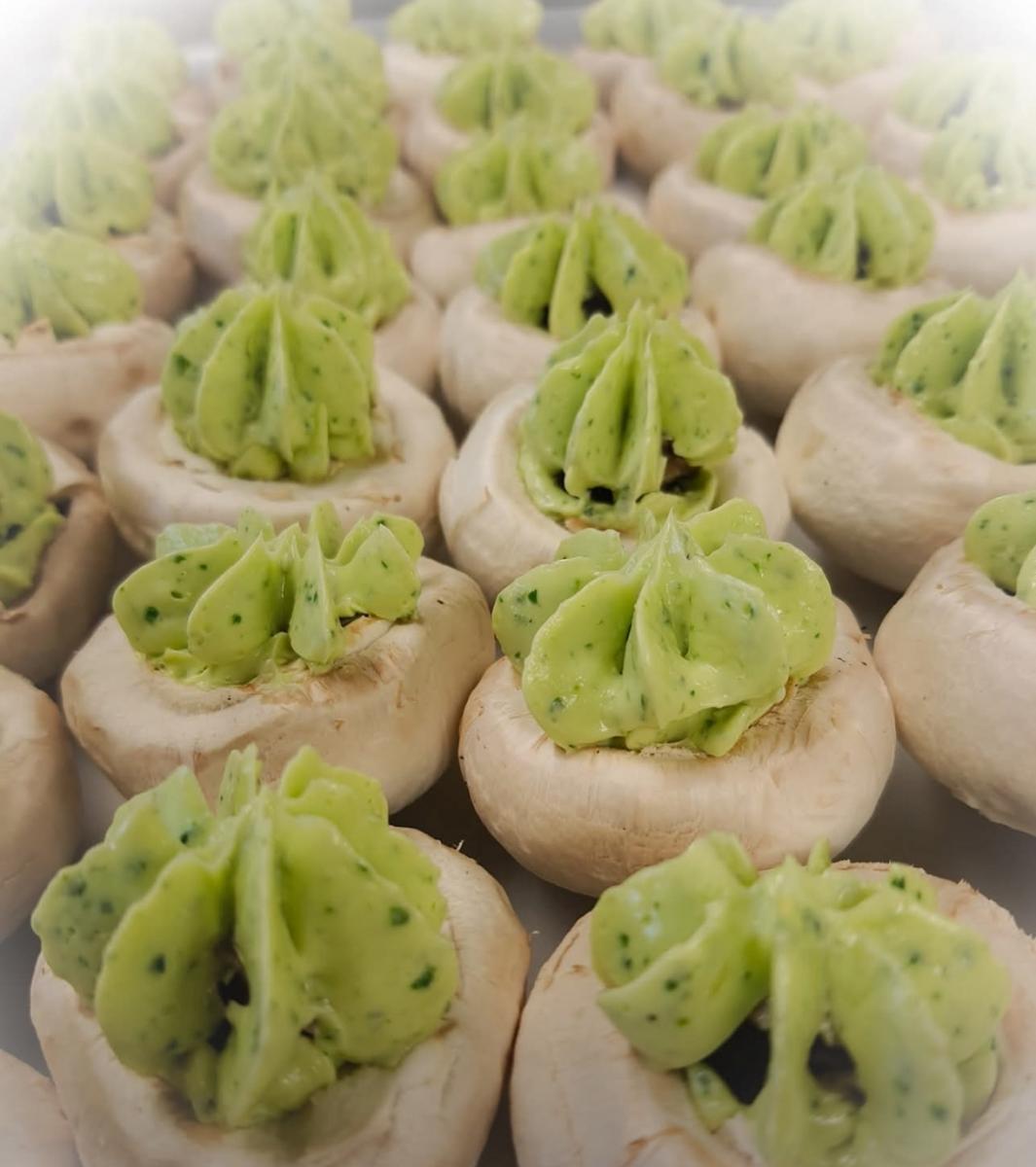 Ingrédients: ESCARGOTS* (cuit au Court Bouillon VIN BLANC* ), Farce ( BEURRE*, Ail, Persil, Echalote), Champignon de paris.