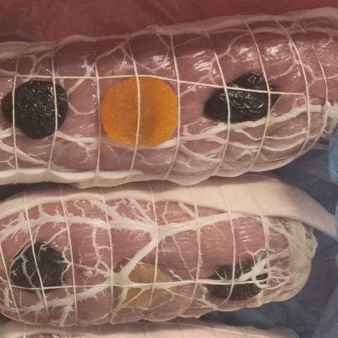 Filet mignon de porc, farce de porc, fruits sec (abricots, raisins,...) sel, poivre, épices