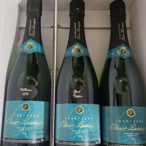 Champagne Olivier Lassaigne Blanc de Blancs brut, brut nature et millésime 2019 en coffret de bouteilles de 0,75cl .