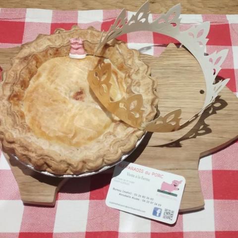 Pate feuilletée pur beurre faite maison, jambon, crème fraiche, emmental, sel, poivre, fève cochonne et couronne. Déjà cuite, elle est juste à faire réchauffer 15-20 min, à 80-90 °C au four